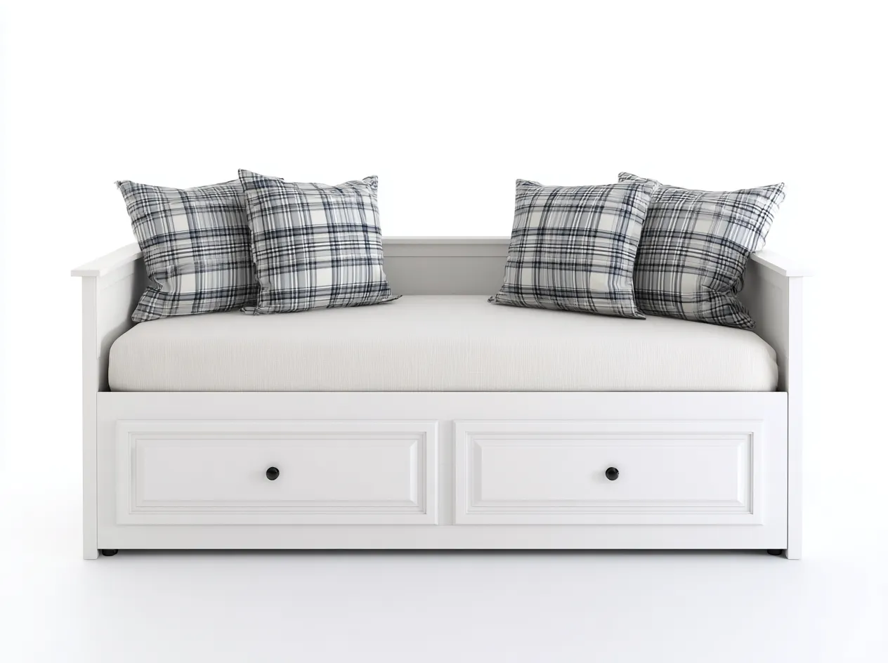 Przestrzeń pod siedziskiem pomaga przechowywać pościel, koce oraz tekstylia domowe. Sofa może pełnić funkcję kanapy dziennej, miejsca relaksu lub dodatkowego łóżka dla gości. Zabudowane boki oraz tylne oparcie poprawiają wygodę podczas codziennego korzystania.