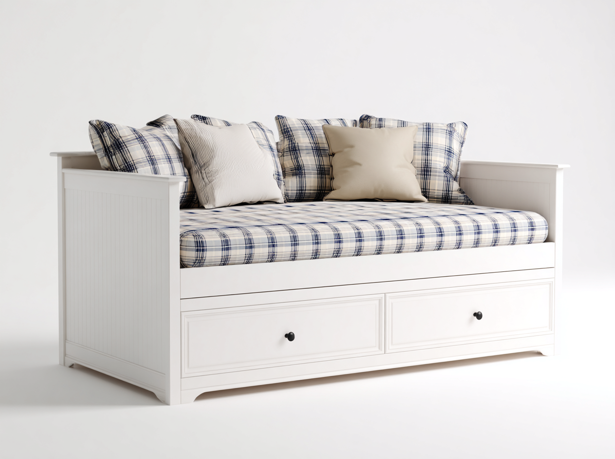 Przestrzeń pod siedziskiem pomaga uporządkować pościel, koce oraz tekstylia domowe. Sofa może pełnić funkcję kanapy dziennej, miejsca relaksu lub dodatkowego łóżka dla gości. Stabilna konstrukcja dobrze sprawdza się w codziennym użytkowaniu.